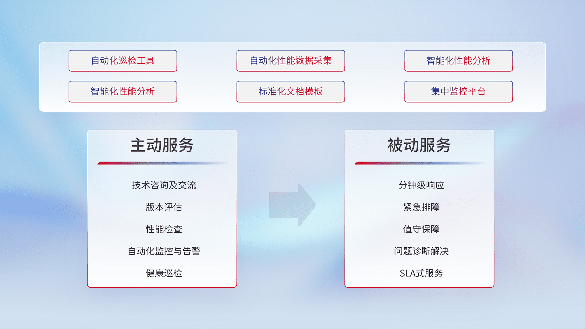 智能化工具和标准化文档,,,保障服务质量,,,提供主动服务(包含技术咨询、、、版本评估、、、性能检查、、、、自动化监控与告警、、、、健康巡检)和被动服务包含(分钟级响应、、紧急排障、、值守保障、、问题诊断解决、、SLA服务)。。。。